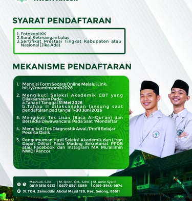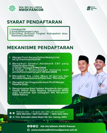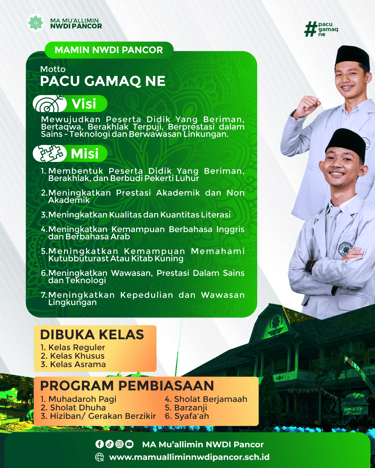 MAS MU’ALLIMIN NWDI PANCOR sebagai salah satu Madrasah Pertama di yayasan pendidikan Hamzanwadi NWDI Pancor senantiasa berusaha mewujudkan apa yang menjadi harapan pemerintah dan masyarakat melalui serangkaian kegiatan dan program kerja yang berorientasi kepada peningkatan kualitas dan daya saing lulusan yang berakhlaqul karimah.